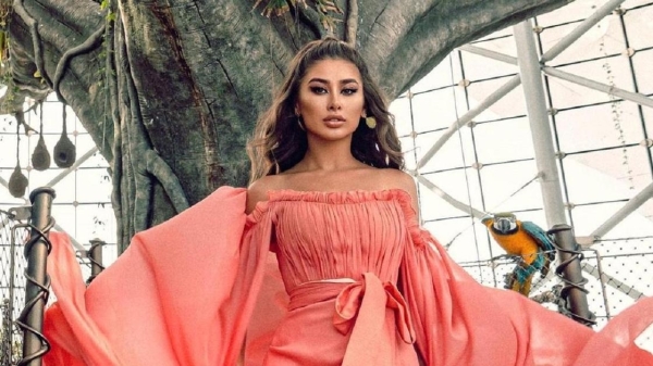 Асель предстала в шифоновом мини-платье с открытыми плечами и удлиненной накидкой кораллового цвета. Образ она дополнила ярким макияжем и распущенными локонами.
