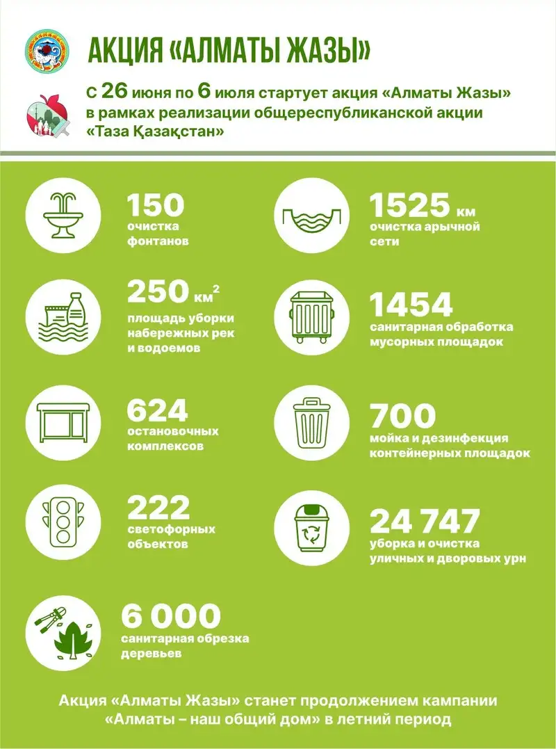 В рамках акции "Алматы Жазы" с 26 июня по 6 июля планируется провести работы по уборке внутридворовых территорий города от мусора, а также территории набережных рек и водоемов площадью 250 кв. км.