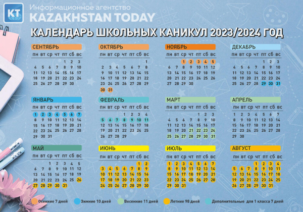 По графику, утверждённому Министерством просвещения РК, осенью казахстанские школьники отдохнут 7 дней — с 30 октября по 5 ноября. Если добавить к этим дням субботу и воскресенье, 28 и 29 октября, то в общей сложности выйдет 9 дней.