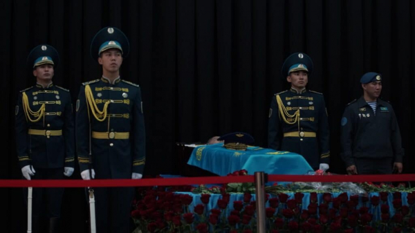 Корреспондент «Курсива» с места события рассказывает, что хоронят Талгата Мусабаева как героя. Проститься с Мусабаевым пришло много людей, в том числе военные и полицейские.