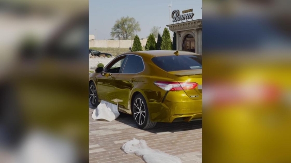 Девушка лишь запрыгивает за руль золотой Toyota Camry и уезжает с мероприятия, оставив возле ресторана расстроенного жениха и фату – на асфальте.