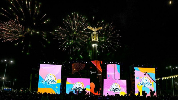 Собравшиеся на площади жители и гости Актобе увидели не только выступления знаменитых певцов, но и красочный фейерверк, озаривший ночное небо города на белом холме тысячей ярких огней.