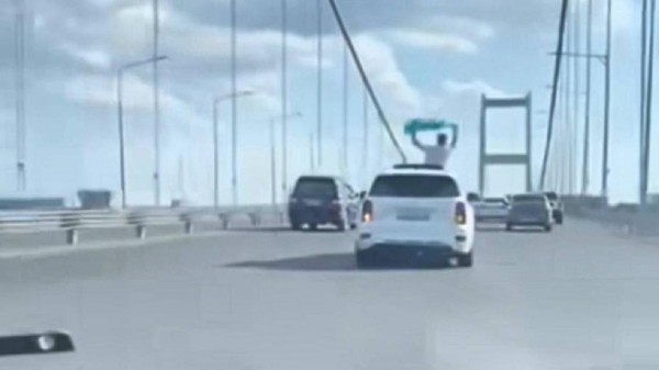 На опубликованном в Сети ролике запечатлен молодой человек с флагом Казахстана, который вылез из люка автомобиля, следующего на скорости по подвесному мосту.