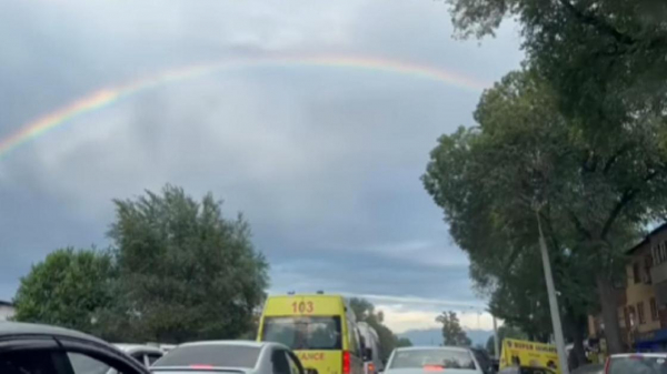 Кроме того очевидцам удалось запечатлеть радугу в небе над Алматы.