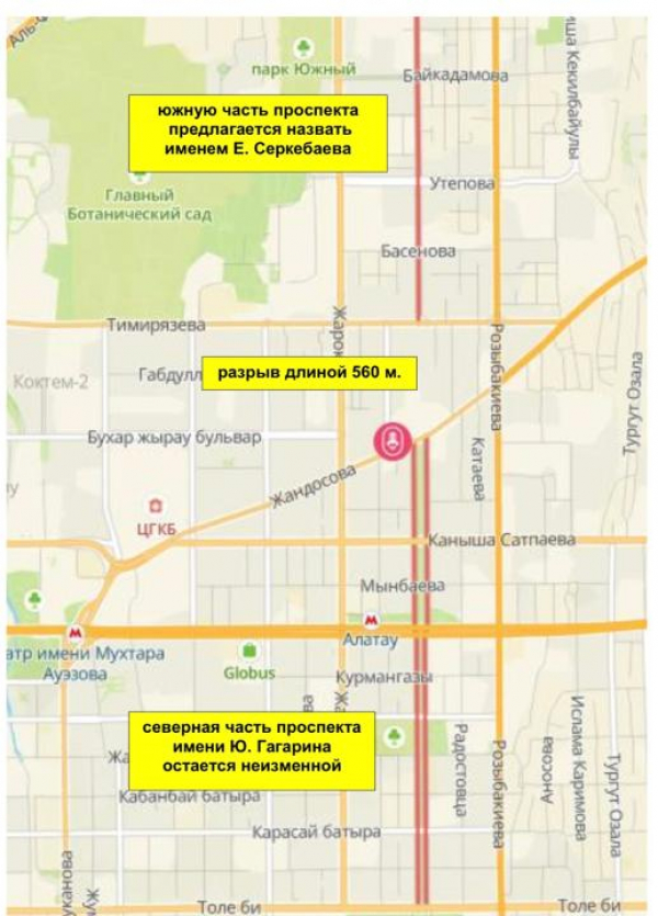 Основная, бульварная часть проспекта Ю. Гагарина от ул. Толе би прерывается на ул. Жандосова и продолжается только через 2 квартала, или 560 метров. При этом на данном отрезке нет пешеходных или иных путей. Учитывая данное обстоятельство, а также растущее население города, необходимо принять во внимание, что в условиях современных городов усложняется навигация для жителей, гостей и туристов.