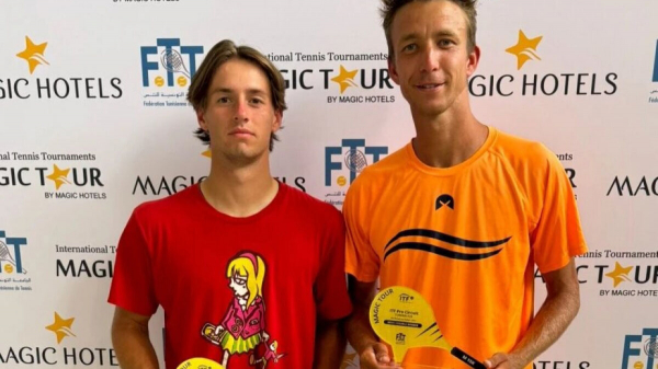 Казахстанский теннисист три недели подряд побеждает в парном разряде турниров категории ITF M15 в Тунисе. На этот раз Григорий в паре с россиянином Егором АГАФОНОВЫМ (на снимке) обыграл в финале дуэт Сарайвы дос САНТОСА (Бразилия) и Криса ван ВИКА (ЮАР) — 6:3, 6:3. Это уже 28-й титул в карьере уроженца Темиртау в парном разряде под эгидой Международной федерации тенниса. На этой неделе Ломакина ждёт ещё один турнир в Тунисе.